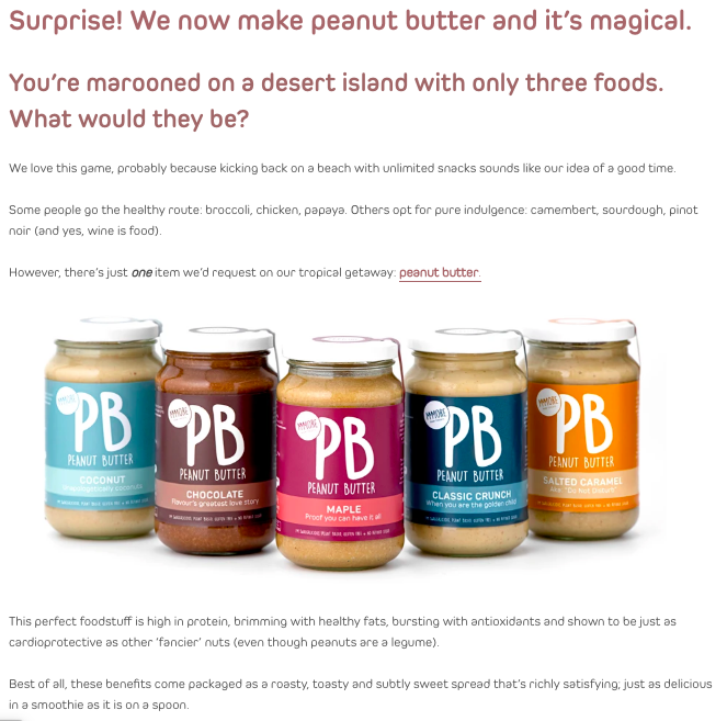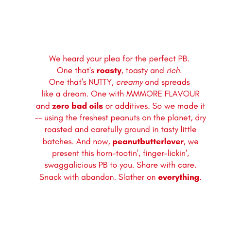 When Lenka called to ask, “Hey, want to brainstorm a range of peanut butters with me?”, I thought my life was complete. And it was, until an almost-too-heavy-to-lift box of MMMORE PB arrived on the doorstep eight weeks later. Guess how long it lasted.