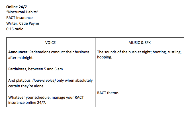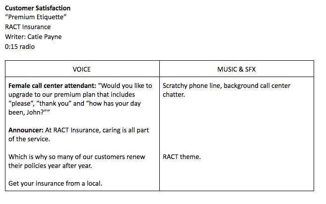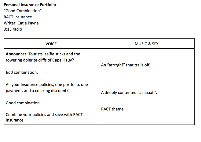 RACT is a best-loved Tassie auto club, owned by its members. Through the good folks at Before Creative, I’ve been fielding radio, press and TVCs for various arms of RACT, recalling all the things I love about that wild island to write recognisably Tasmanian copy. Here are some short radio scripts from 2020.