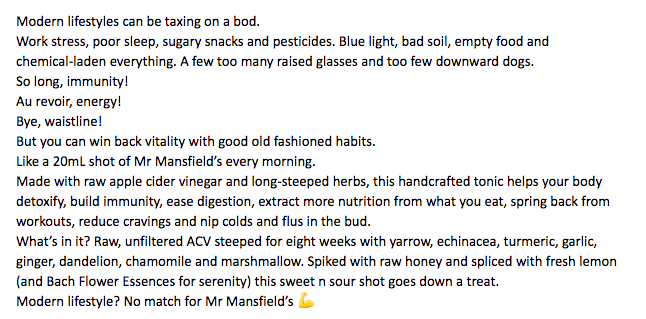 Before I was a copywriter, I was a witch; the licensed kind. So writing about herbs and health is a comfort zone I’m very willing to inhabit. McDowells asked me to come up with a new creative concept and Facebook ad copy for their all-in-one health tonic Mr Mansfield’s Daily Ritual. My insight was that good health looks different on everybody, and is as much about having the courage to be yourself as lifting a 50kg barbell. This led me to the line ‘All kinds of strong’ and a creative concept that honoured their fairground/vintage aesthetic.
